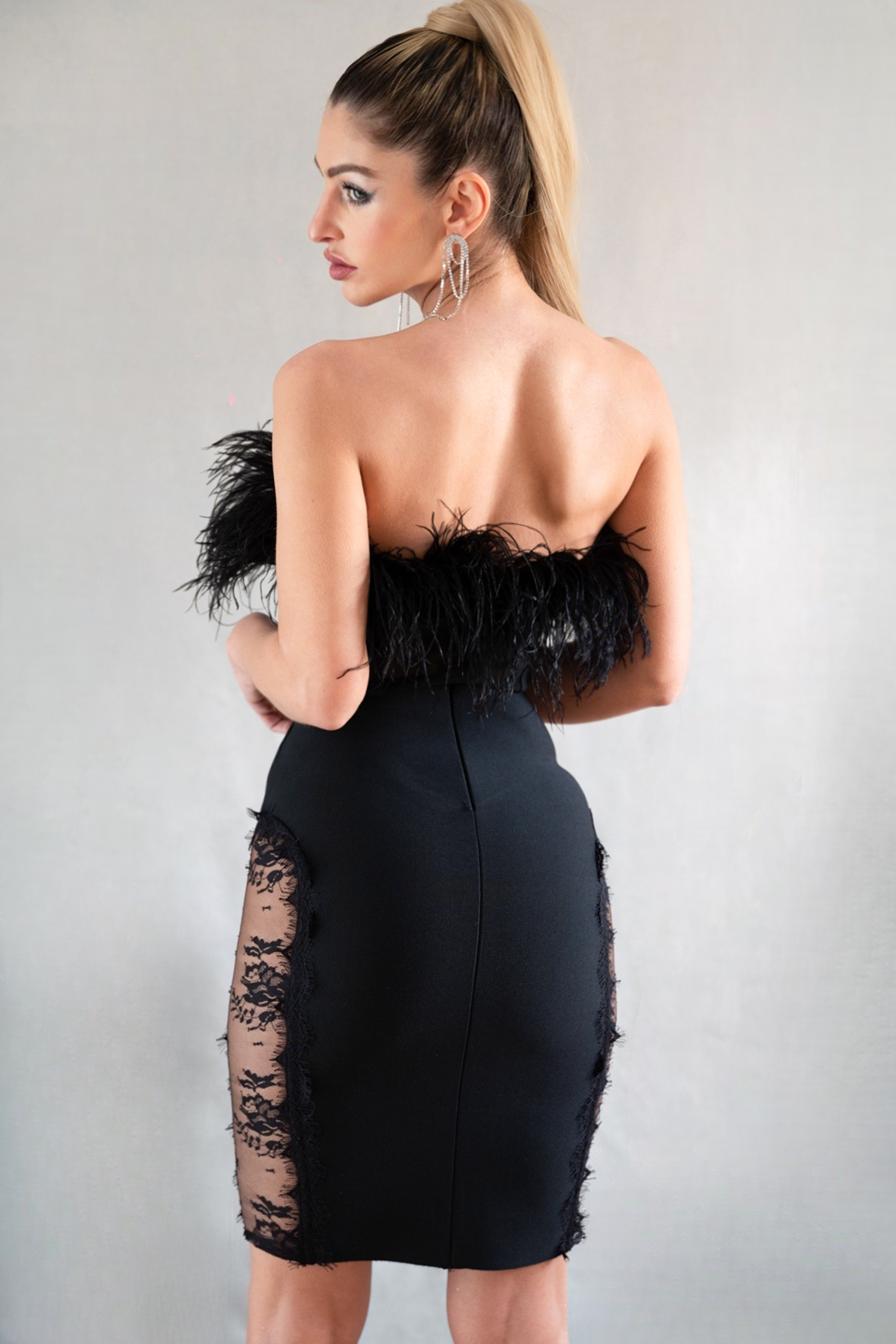 Let the night be all about you looking chic in the Aanisah Feather Midi Bandage Dress. Comfy bandaged fabric. strapless design. feathered embellishment and netting on the side of the dress all make for a stylish and sexy look. Accessorize with sparkly accessories and stiletto heels to get out and about.