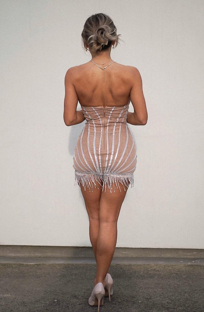 A Crystal Fringe Mini Dress is a stunning and eye-catching garment that combines a corset-style top with a playful fringe skirt. The dress features a fitted bodice with a sweetheart neckline and a lace-up back to create a flattering. hourglass silhouette. The corset top is adorned with shimmering crystals that add a touch of glamour and sophistication to the dress.