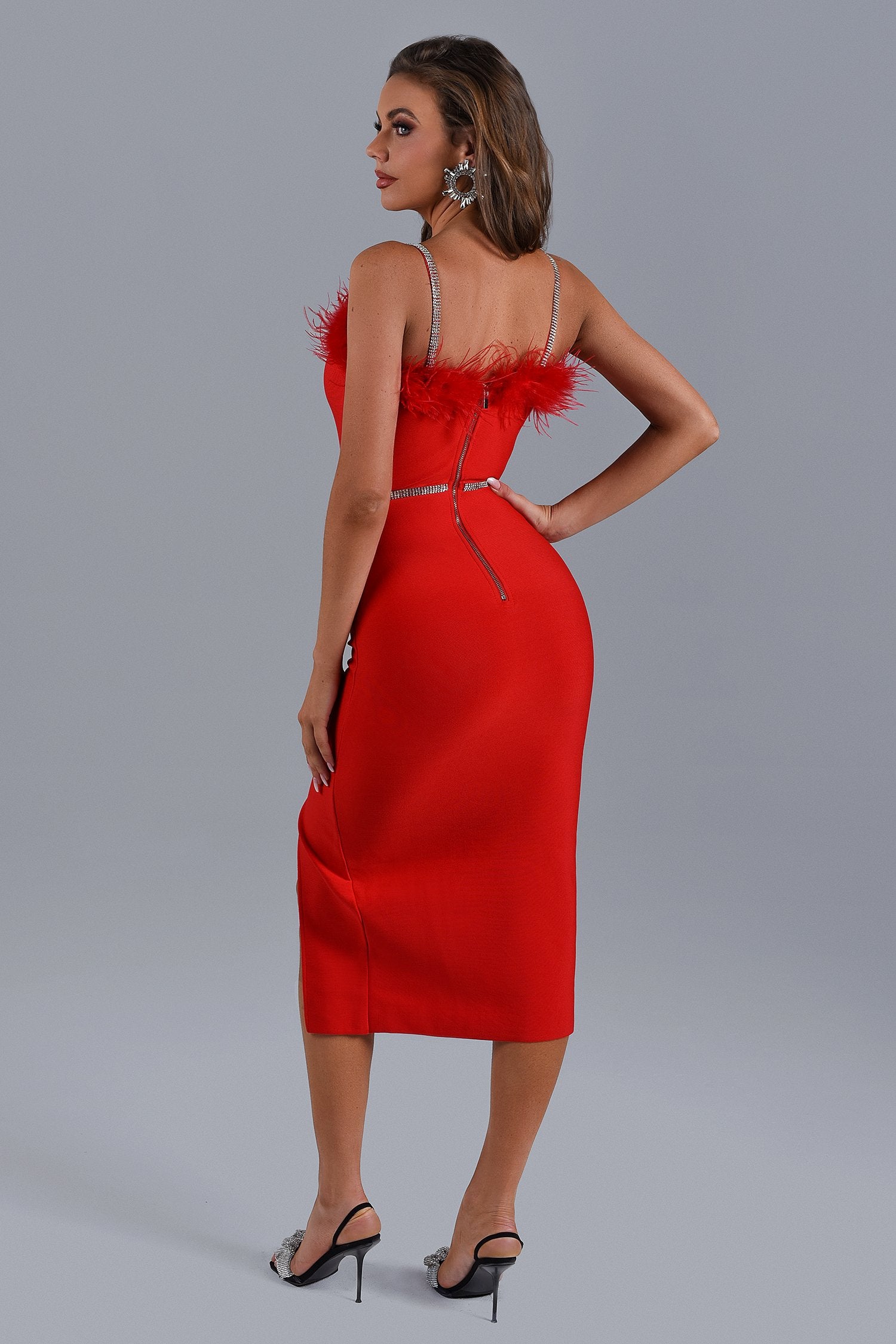 The remarkable Dana Feather Slit Midi Bandage Dress is the perfect frock for any occasion! The feather design on the chest and the small slit at the hem make the whole dress elegant and touching. Perfect with stiletto heels and a mini bag.