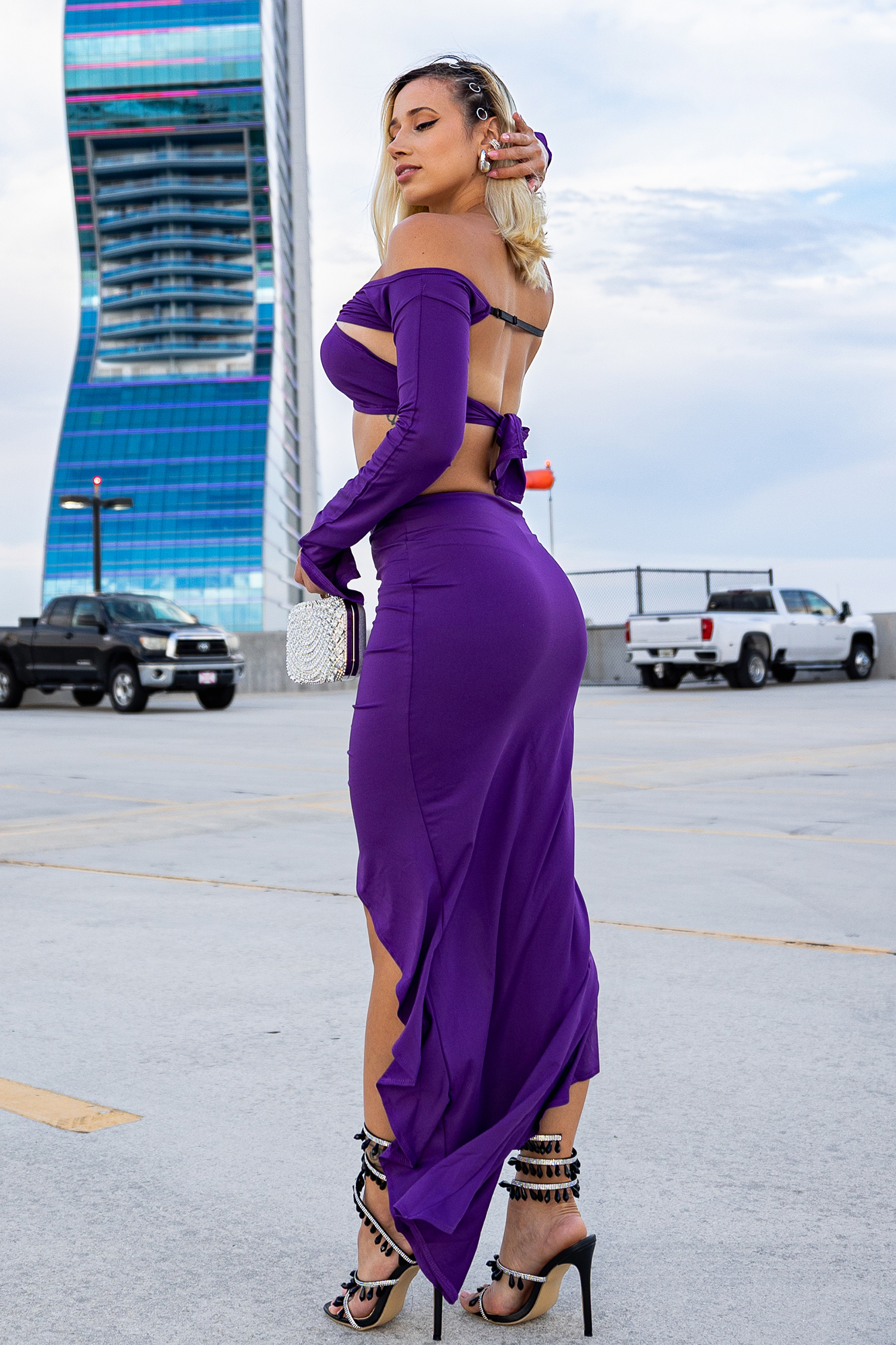 This one a kind Danelle Set is a must have dress for your next big event! High quality fabric. with appropriate ruched details. shapes this two-piece dress that has a cropped tank top with long sleeve and backless. The matching maxi skirt has a wrap silhouette that ties at the waist and has a ruffled high-low hem. Pair with a sparkly necklace and earrings and head out for the night!
