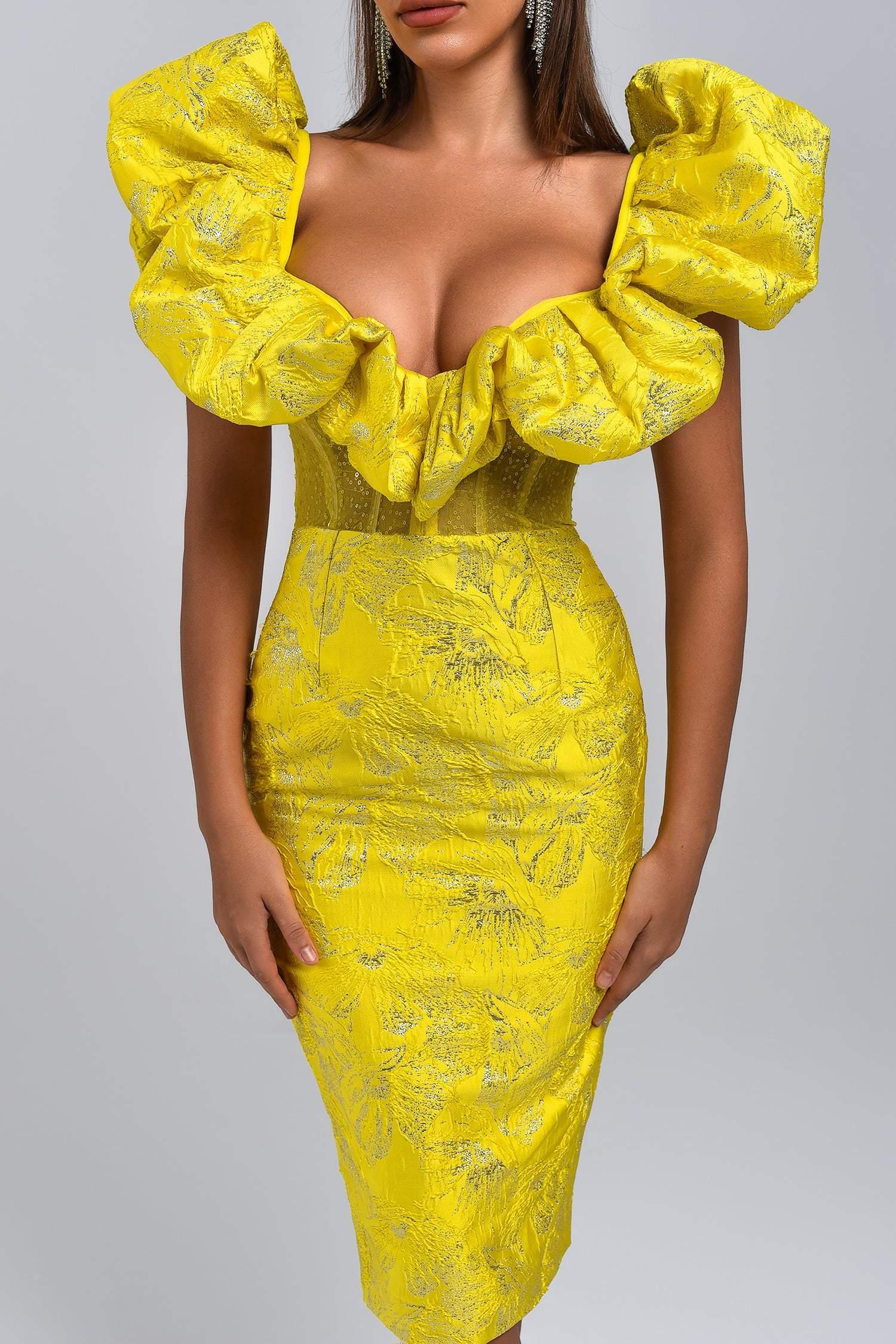 The Melany Jacquard Midi Dress will leave you positively spellbound! The comfortable fabric creates a big lace neckline. a gorgeous print and a figure-hugging dress. Vibrant yellow tones not only make you look stunning. but also add a stylish style. Complete the look with shiny earrings and your favorite clutch.
