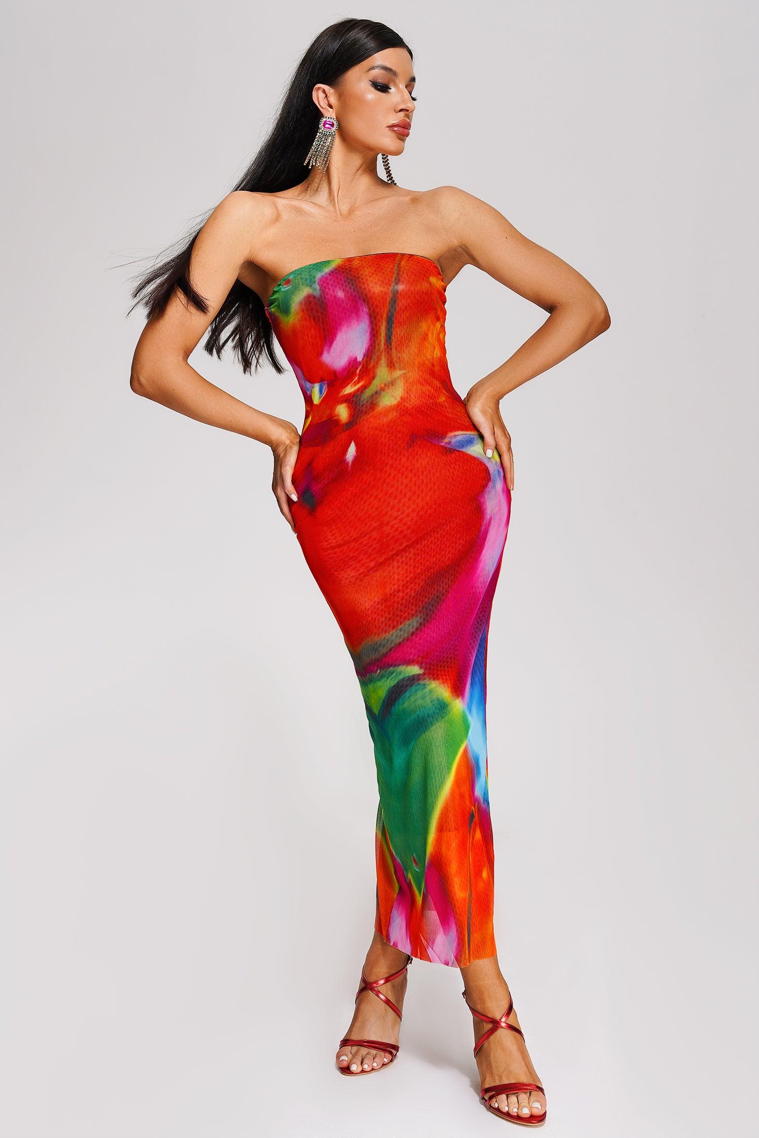 Don't miss out on the chance to steal the show in The Opala Strapless Printed Midi Dress! The mesh fabric gives the dress a delicate and airy quality. The dress features a beautiful floral print that is both feminine and eye-catching. while the strapless design adds a touch of sophistication and glamour. Pair with red heels for an unforgettable look!