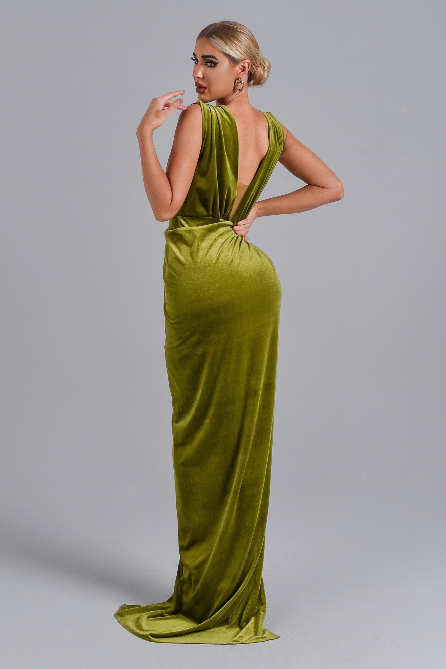 The compliments won't stop rolling in when you're wearing the Saffron Velvet Maxi Dress! Velvet fabrics create a glamorous evening dress with front and back V necklines and a skirt inside and a floor-length outside. The mesh design at the bottom of the chest side adds a sexy vibe just right. Complete the look with stiletto heels and a shiny mini bag.