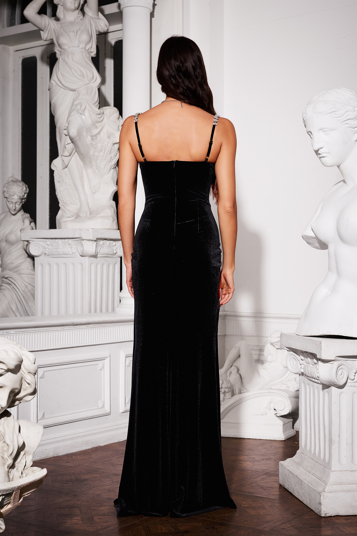 Stand out from the crowd with the Sheath Hot Drills Max Dress. bringing a modern edge to classic elegance! The Sheath Hot Drills Max Dress in black showcases a sleek. form-fitting silhouette adorned with eye-catching hot drills and a double side slit. offering both elegance and a touch of mystery. This dress pairs beautifully with silver or diamond jewelry for added sparkle and sophistication.